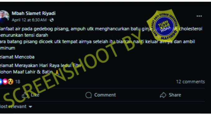 Beredar unggahan di media sosial Facebook yang mengklaim air batang pisang ampuh untuk menghancurkan batu ginjal, asam urat, kolesterol dan menurunkan tensi darah.