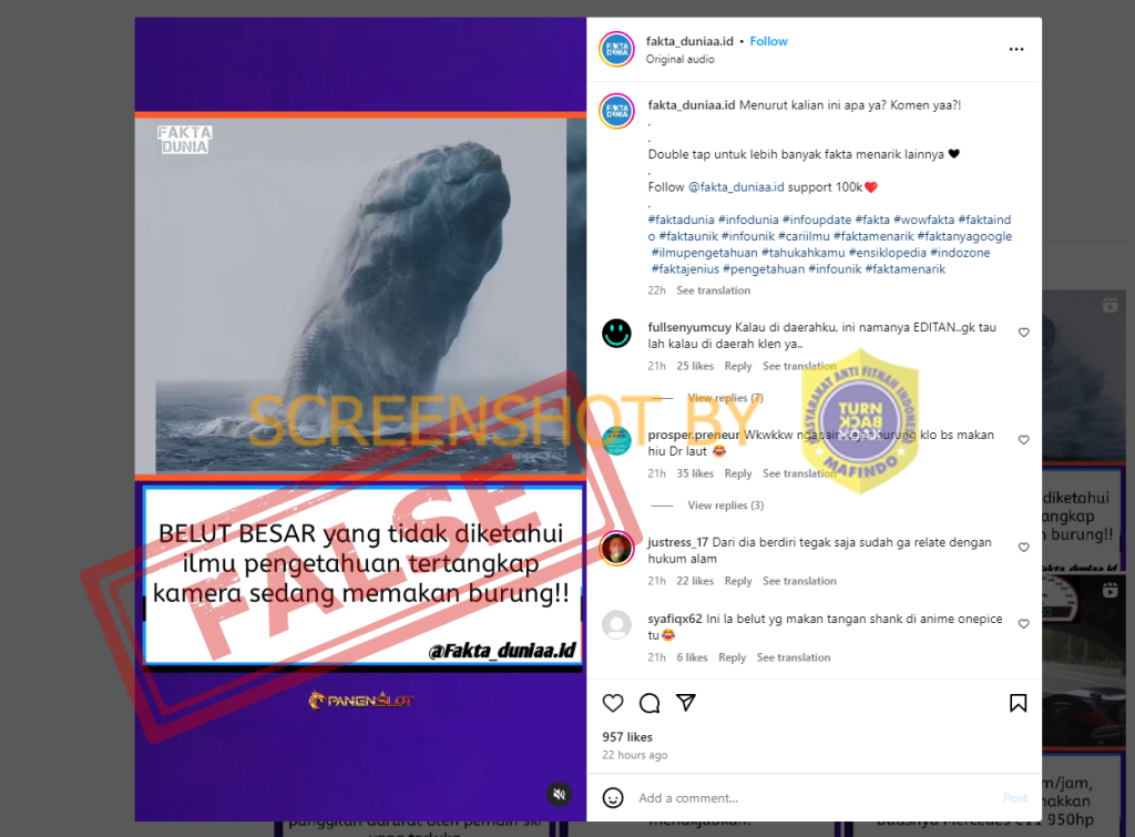 (GFD-2024-19482) [SALAH] Video “BELUT BESAR yang tidak diketahui ilmu pengetahuan tertangkap kamera sedang memakan burung”