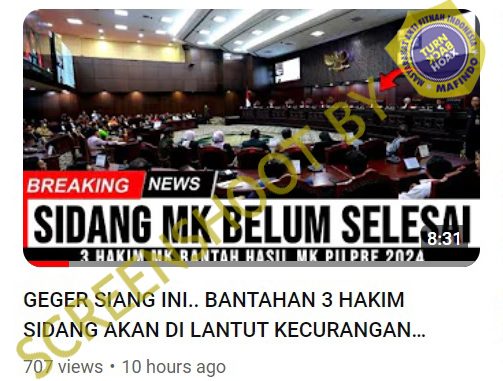 Setelah ditelusuri, thumbnail yang ditampilkan dalam video tersebut merupakan momen ketika suasana pembacaan keputusan MK terkait penarikan atau pencabutan permohonan uji batas minimal usia Calon Presiden dan Calon Wakil Presiden pada 2 Oktober 2023.