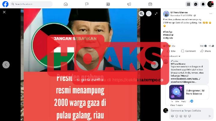 Konten itu memuat foto Prabowo Subianto dalam setelan jas hitam dan bendera Palestina. Hingga 20 November, konten itu telah mendapatkan hampir seribu komentar dan dibagikan ulang 10 kali.