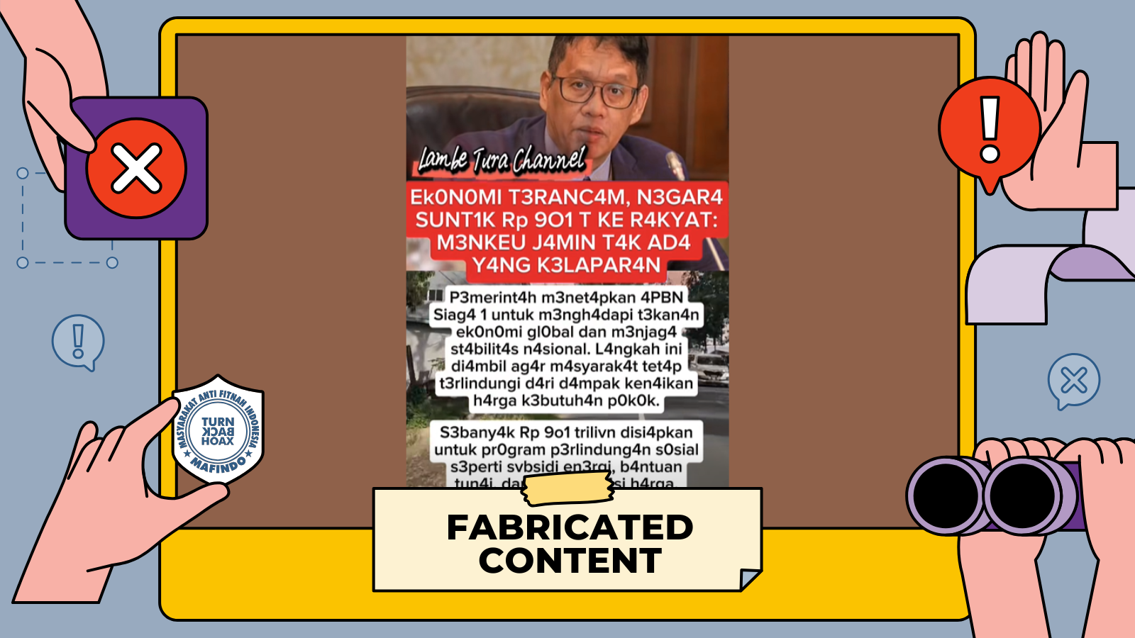 Unggahan video berisi klaim “pemerintah suntik Rp901 triliun ke rakyat lewat APBN siaga 1” merupakan konten palsu (fabricated content).