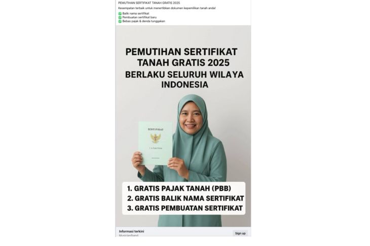 Jakarta (ANTARA/JACX) – Sebuah unggahan di Facebook menarasikan tautan untuk program pemutihan sertifikat tanah gratis tahun 2025.