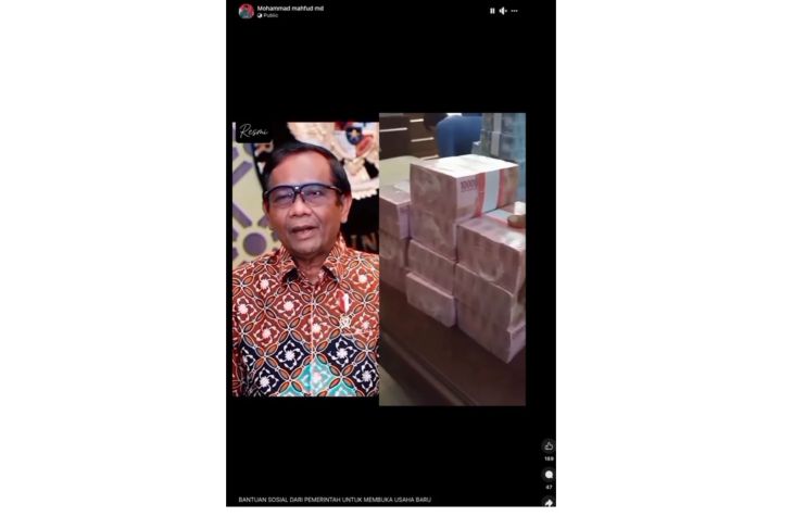 Jakarta (ANTARA/JACX) – Sebuah unggahan video di Facebook berdurasi 50 detik menarasikan bahwa mantan Menteri Koordinator Bidang Politik, Hukum, dan Keamanan (Menko Polhukam) Mahfud MD mengumumkan uang sitaan hasil perampasan aset koruptor sebesar Rp10 miliar akan dibagikan kepada masyarakat dalam bentuk bantuan sosial (bansos).