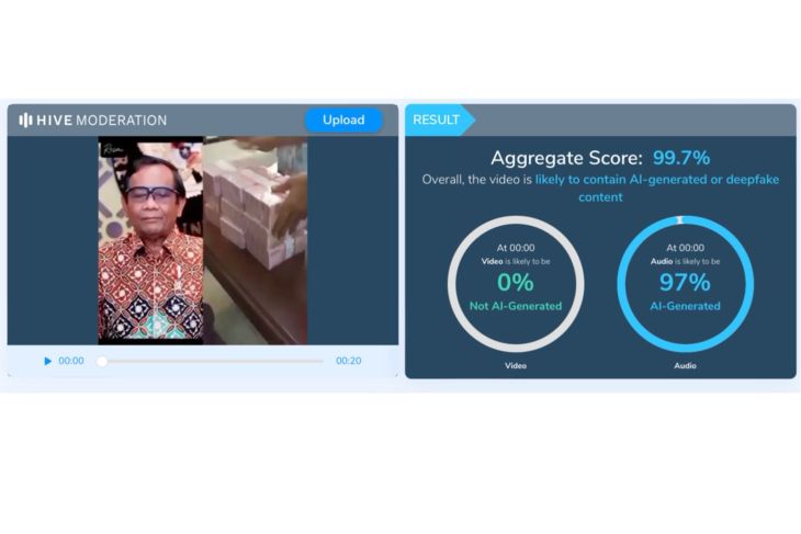 ANTARA memverifikasi unggahan ini menggunakan AI detector Hive Moderation, dan hasilnya menunjukkan bahwa audio dalam video tersebut 99,7 persen merupakan hasil rekayasa kecerdasan buatan (AI).