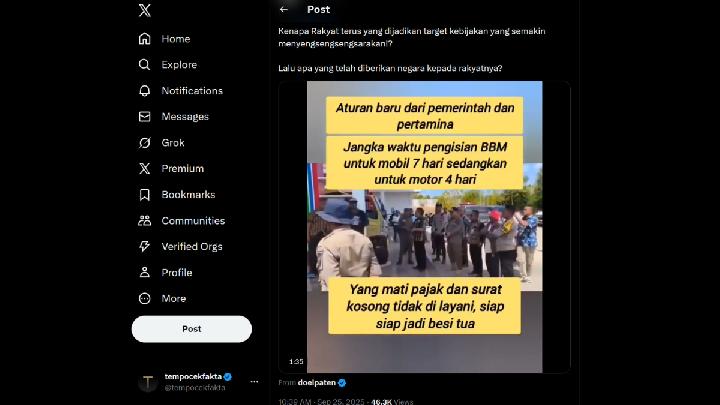 Verifikasi Tempo menyimpulkan, video pengumuman pembatasan pembelian BBM berdasarkan jenis kendaraan dalam waktu tertentu adalah sebagian benar.