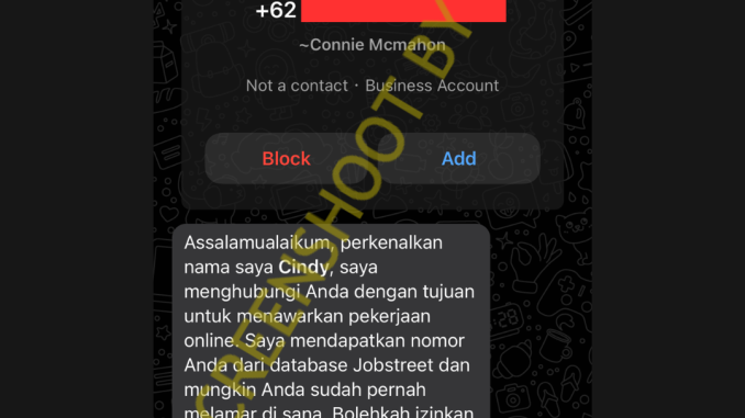 “Assalamualaikum, perkenalkan nama saya Cindy, saya menghubungi Anda dengan tujuan untuk menawarkan pekerjaan online. Saya mendapatkan nomor Anda dari database Jobstreet dan mungkin Anda sudah pernah melamar di sana. Bolehkah izinkan saya mula dengan menjelaskan pekerjaan ini secara singkat?”
