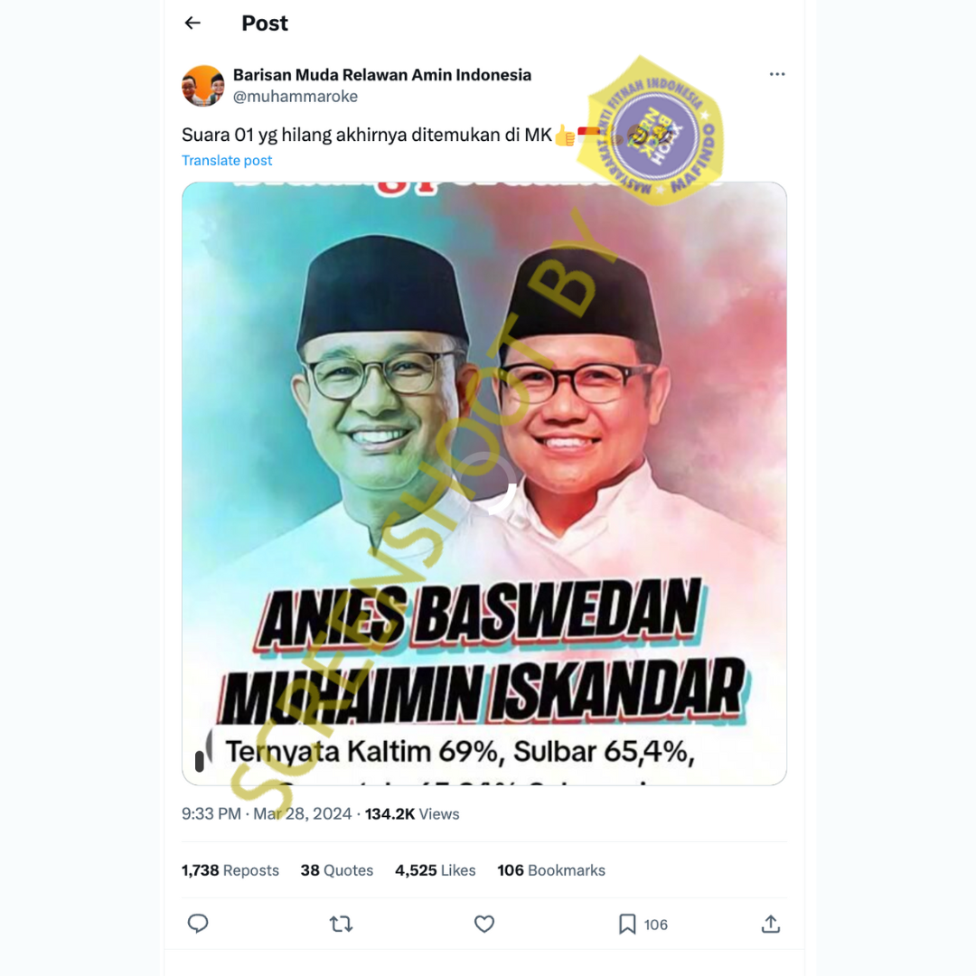 Akun Twitter/X @muhammaroke mengunggah cuitan yang melampirkan video dengan klaim bahwa sejumlah perolehan suara pasangan calon presiden dan wakil presiden nomor urut satu, Anies Baswedan dan Muhaimin Iskandar (AMIN) hilang. Perolehan suara yang hilang kemudian dibacakan pada sidang perdana MK mengenai sengketa hasil Pemilu 2024.