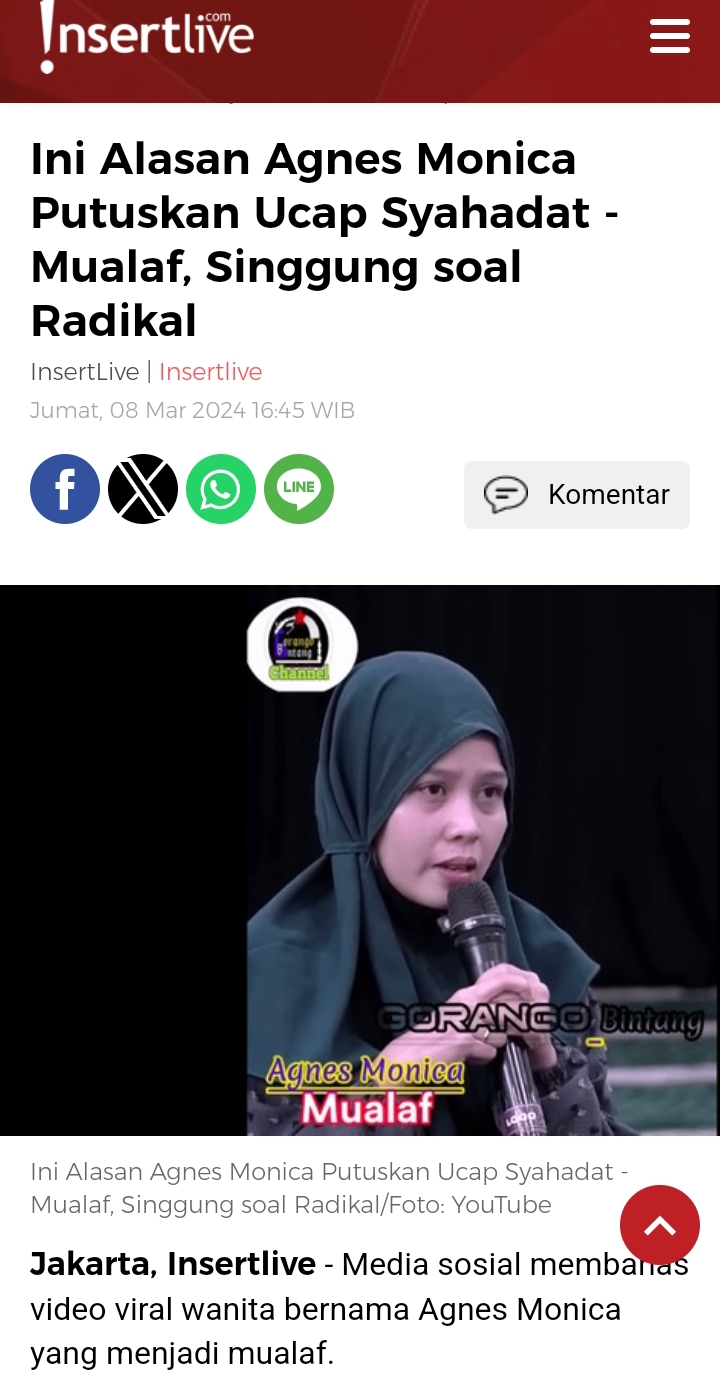 Setelah dilakukan penelusuran, faktanya narator mengambil narasi artikel milik Insertlive dengan judul “Ini Alasan Agnes Monica Putuskan Ucap Syahadat-Mualaf, Singgung soal Radikal”.