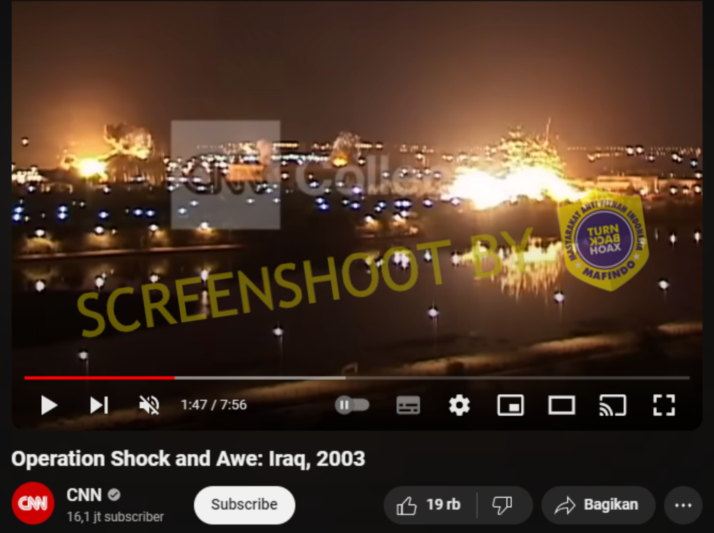 Setelah dilakukan penelusuran, ditemukan video yang terlihat identik telah diunggah di Youtube CNN pada 22 Juli 2016 lalu yang berjudul “Operation Shock and Awe: Iraq, 2003”. Video tersebut merupakan rekaman lama yang menampilkan pengeboman di Baghdad, Irak, pada tahun 2003 yang lalu.