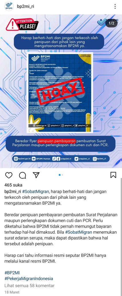 “Beredar penipuan pembayaran pembuatan Surat Perjalanan maupun perlengkapan dokumen cuti dan PCR. Perlu diketahui bahwa BP2MI tidak pernah memungut bayaran terhadap hal-hal dimaksud. Bila #SobatMigran menemukan surat edaran serupa, maka dapat dipastikan bahwa hal tersebut adalah penipuan.” Tulis BP2MI pada laman Instagramnya