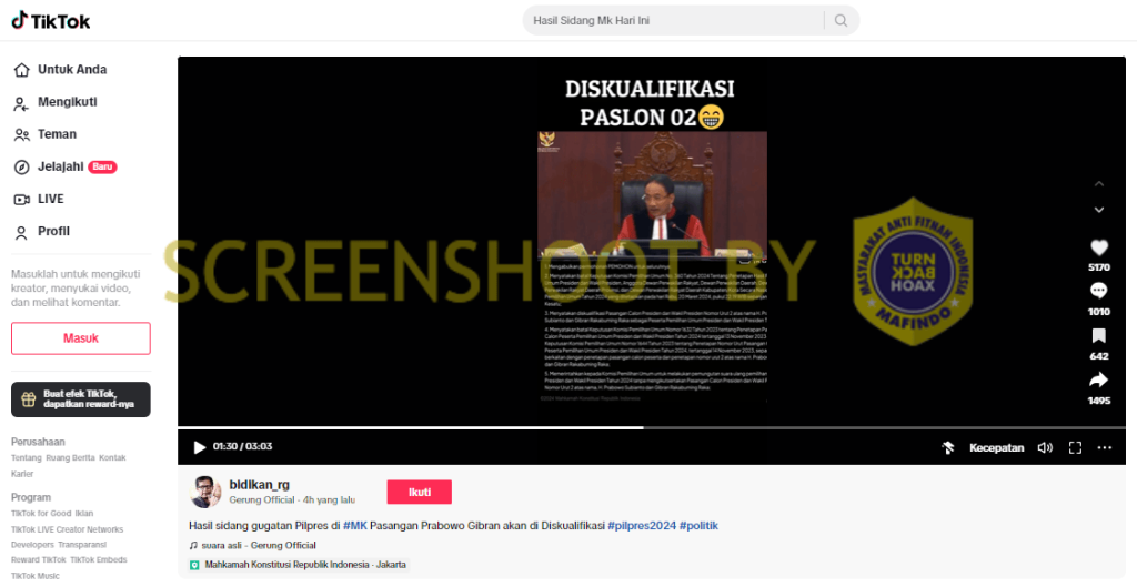 Beredar sebuah video yang mengklaim Hakim Suhartoyo telah membacakan hasil putusan sidang sengketa Pilpres 2024 di Mahkamah Konstitusi (MK) pada 28 Maret 2024. Video itu diunggah oleh akun TikTok Gerung Official, yang telah dilihat 11 ribu pengguna TikTok. Selain menampilkan video Hakim, pengunggah menuliskan beberapa narasi yang diklaim sebagai hasil putusan akhir.