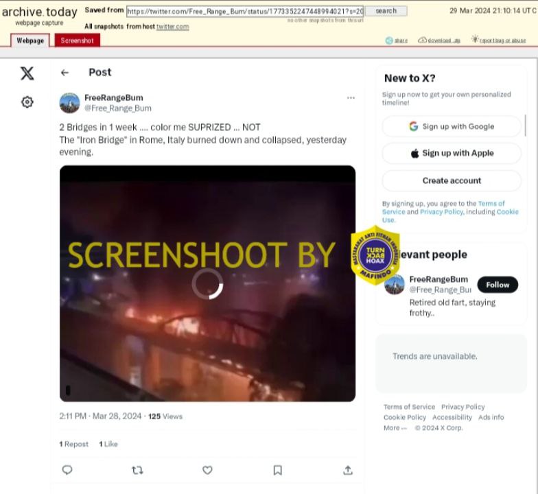 Akun Twitter @Free_Range_Bum mengunggah video yang menunjukkan sebuah jembatan besar terbakar dan roboh. @Free_Range_Bum menklaim bahwa itu adalah jembatan “Iron Bridge” di Roma yang terbakar dan roboh pada 27 Maret 2024.