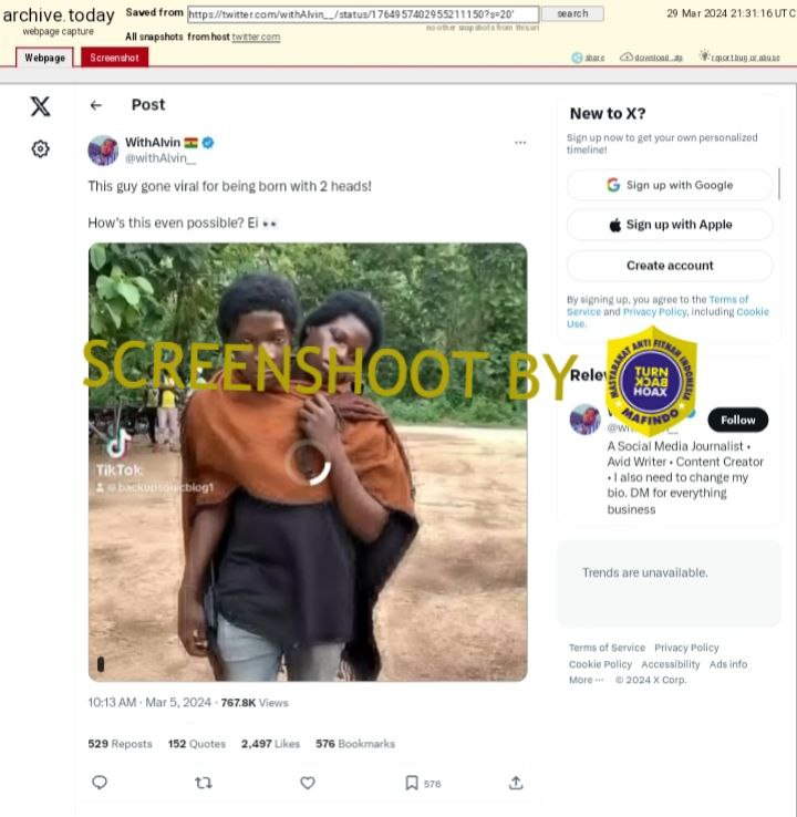 Akun Twitter bercentang biru @withAlvin__ mengunggah video yang diklaim sebagai pria yang terlahir dengan dua kepala. Cuitan dan video yang diunggah pada 5 Maret tersebut telah disukai hampir 2,500 orang, dikutip dan dibagikan ulang lebih dari 600 kali, serta telah dilihat lebih dari 750,000 kali.