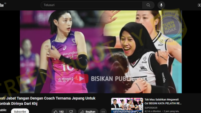 Kanal YouTube @bisikanpublic8558 pada 27 Maret 2024 mengunggah video dengan klaim bahwa pemain Red Sparks asal Indonesia, Megawati Hangestri, telah tiba di Jepang untuk meresmikan pergantian kontrak dirinya dengan klub besar asal Jepang.