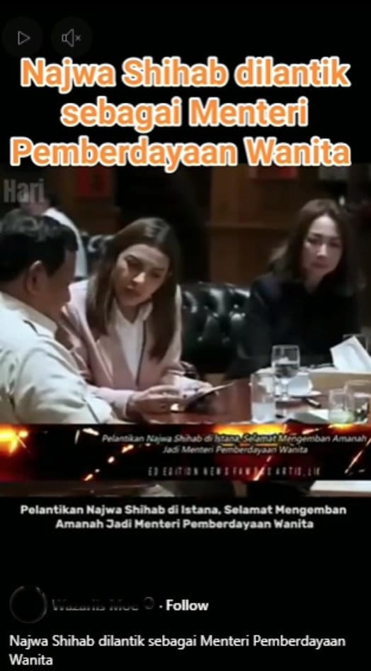 Hasil penelusuran fakta menunjukkan bahwa video dengan klaim Najwa Shihab dilantik menjadi Menteri Pemberdayaan Perempuan di Kabinet Merah Putih bersifat salah dan menyesatkan (false & misleading).