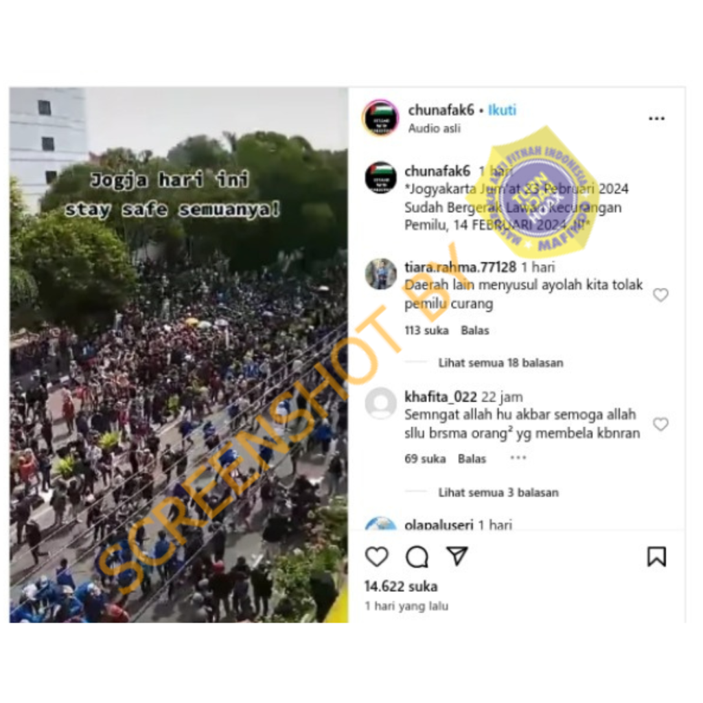Beredar sebuah video melalui platform Instagram yang menampilkan para demonstran dari kalangan mahasiswa berlarian di jalan raya. Video tersebut diunggah dengan klaim merupakan aksi demonstrasi pada 23 Februari 2024 terkait dugaan kecurangan pada saat Pemilu 2024.
