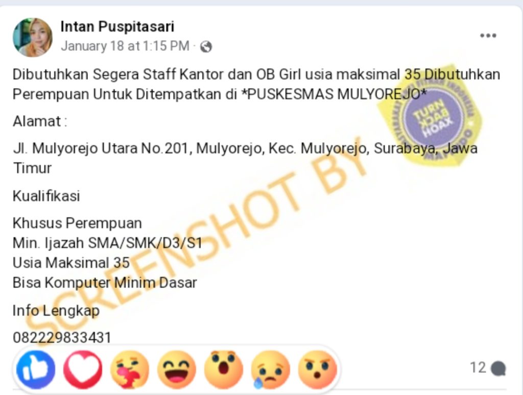 Beredar postingan di grup Facebook membagikan informasi lowongan pekerjaan di Puskesmas Mulyorejo. Dalam unggahan tersebut disebutkan Puskesmas Mulyorejo membutuhkan karyawan dan OB khusus perempuan, usia maksimal 35 tahun, minimal ijazah SMA.
