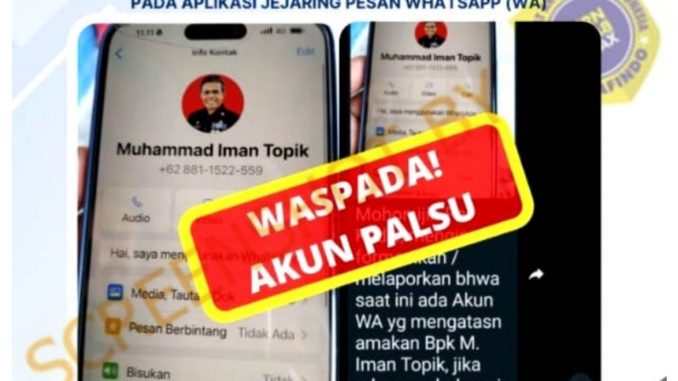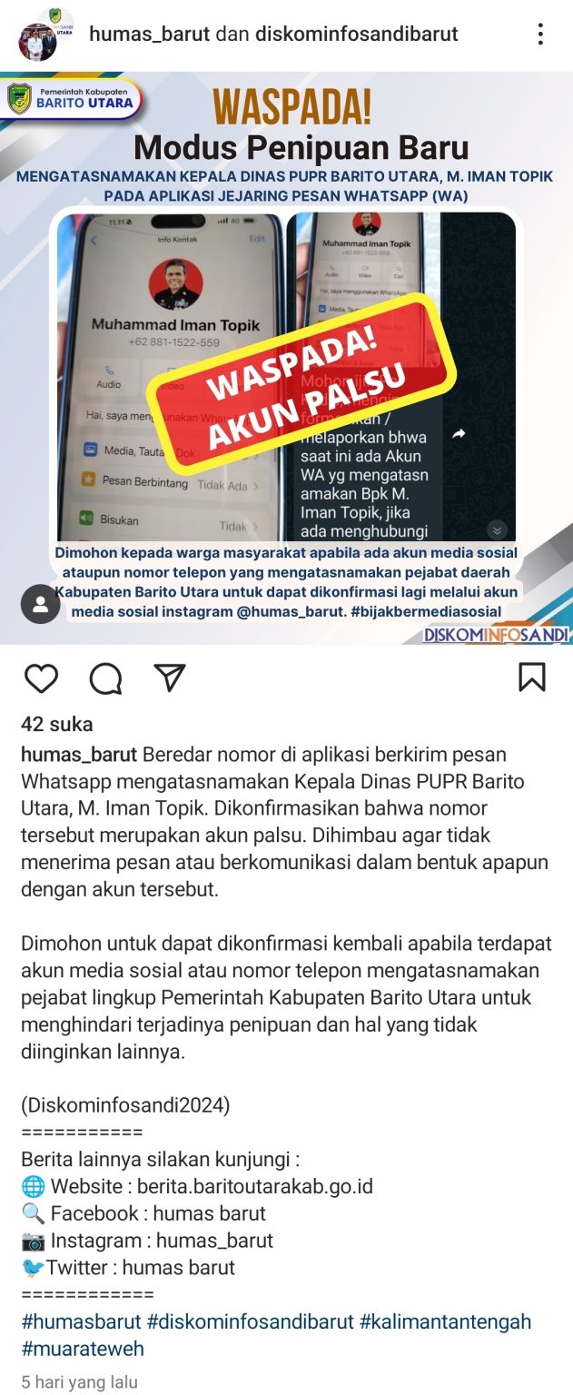Beredar akun WhatsApp mengatasnmakan Kepala Dinas Pekerjaan Umum dan Penataan Ruang Kabupaten Barito Utara (PUPR Barut), Iman Topik. Akun tersebut memasang nama dan foto Iman Topik memakai pakaian dinas.
