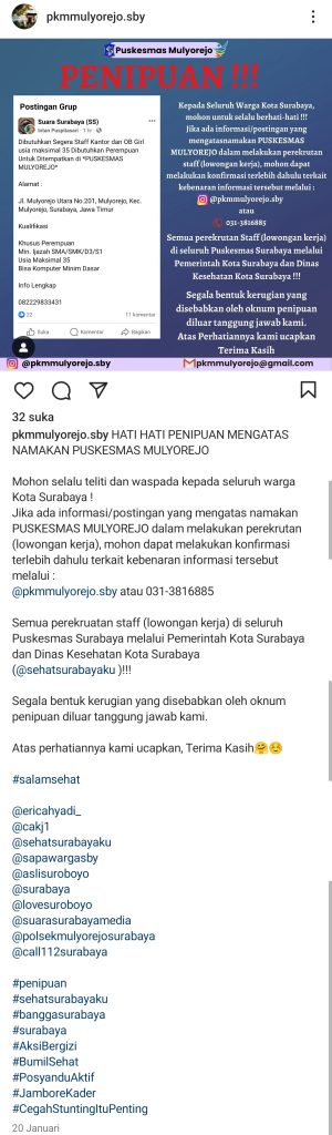 Faktanya lowongan tersebut palsu. Pada media sosial milik Puskesmas Mulyorejo diklarifikasi bahwa lowongan tersebut merupakan penipuan. Pihaknya juga mengimbau kepada masyarakat selalu melakukan konfirmasi terkait kebenaran informasi melalui akun Instagram @pkmmulyorejo.sby atau 031 3816885.