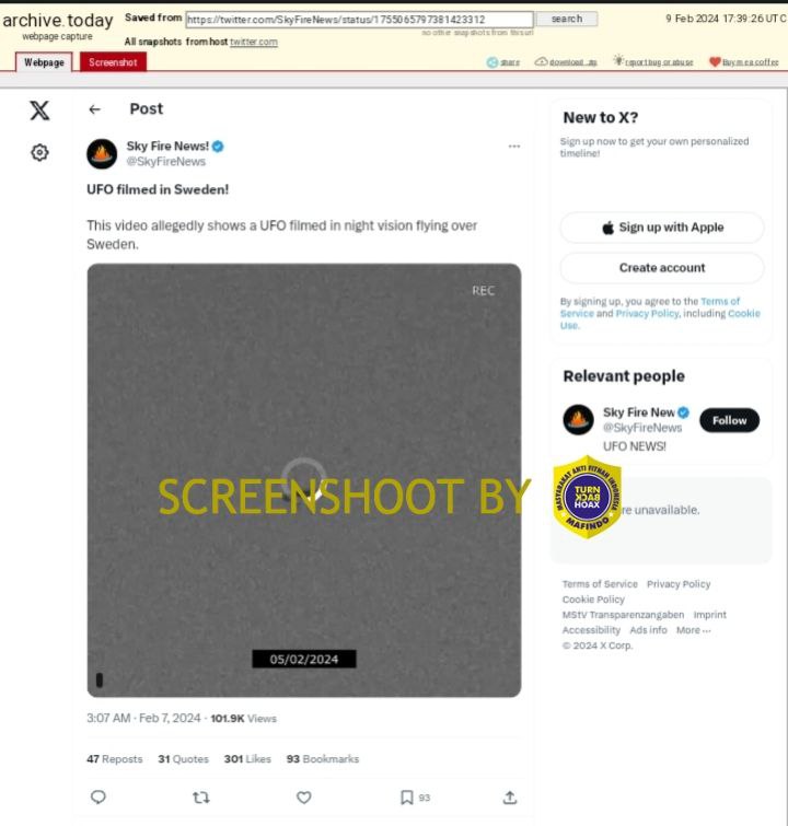 Akun Twitter bercentang biru @SkyFireNews mengunggah video yang terlihat seperti UFO yang direkam dengan night vision. Pengguna Twitter tersebut juga menambahkan informasi bahwa UFO tersebut tertangkap di langit Swedia dan direkam dengan night vision. Cuitan dan video yang diunggah pada 7 Februari tersebut telah disukai lebih dari 300 kali, dikutip dan dibagikan ulang hampir 100 kali, serta telah dilihat lebih dari 100,000 kali.