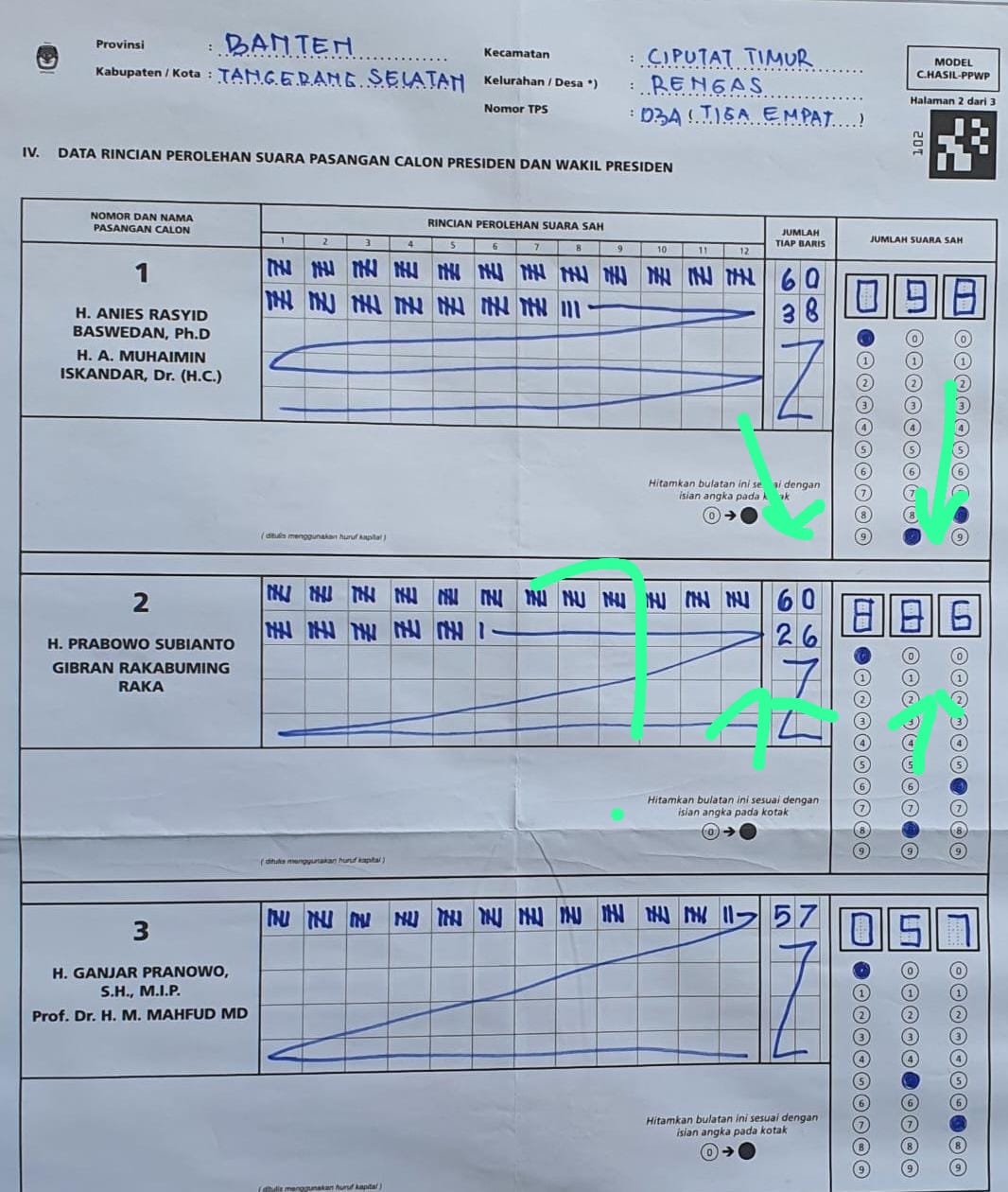 Data menunjukkan telah terjadi kecurangan berupa penggelembungan suara pasangan calon (Paslon) 02, Prabowo-Gibran. Ada tanda panah yang ditulis dengan menggunakan tinta warna hijau yang menunjukkan suara yang diperoleh Paslon 02 sebanyak 86, tapi ditulis 886.