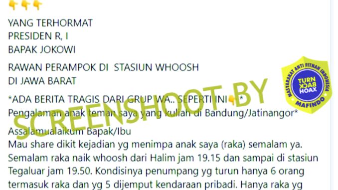 Beredar informasi mengenai insiden penodongan penumpang kereta cepat Whoosh di Tegalluar, Kabupaten Bandung, Jawa Barat yang meminta uang tebusan sebesar 20 juta. Namun setelah dilakukan pencarian fakta diketahui bahwa mahasiswa tersebut hanya mengarang cerita untuk meminta uang kepada orangtuanya.