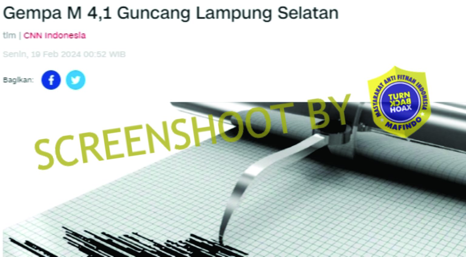 Namun, setelah disimak ternyata narator hanya membacakan sebuah artikel yang diunggah oleh CNNIndonesia yang berjudul “Gempa M 4,1 Guncang Lampung Selatan”. Dalam artikel tersebut dijelaskan bahwa gempa yang mengguncang Lampung Selatan hanya berkekuatan 4,1.