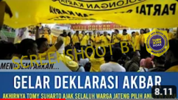 Sebuah video Youtube yang diunggah 12 Februari 2024 lalu membagikan video yang berisikan klaim anak Mantan Presiden Soeharto yaitu Tommy Soeharto mengajak seluruh masyarakat Jawa Tengah untuk mendukung Anies.