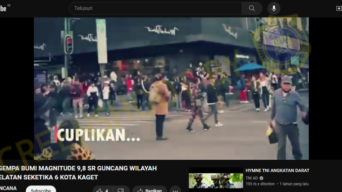 Kanal YouTube @bencanaalam294 mengunggah video dengan klaim bahwa bencana gempa bumi berkekuatan magnitudo (M) 9,8 telah mengguncang wilayah Lampung Selatan pada 21 Februari 2024.