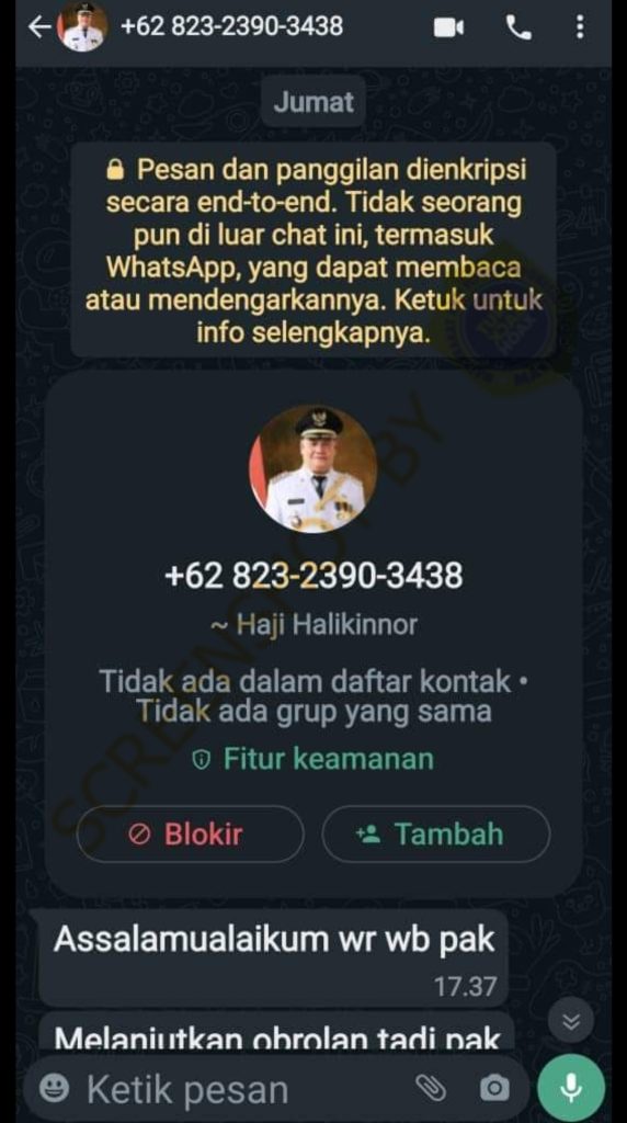 Beredar akun WhatsApp mengatasnmakan Bupati dan Wakil Bupati Kotawaringin Timur, yaitu Halikinoor dan Irawati. Akun tersebut mengirimkan pesan kepada salah satu pengurus masjid dan meminta nomor rekening pengurus.