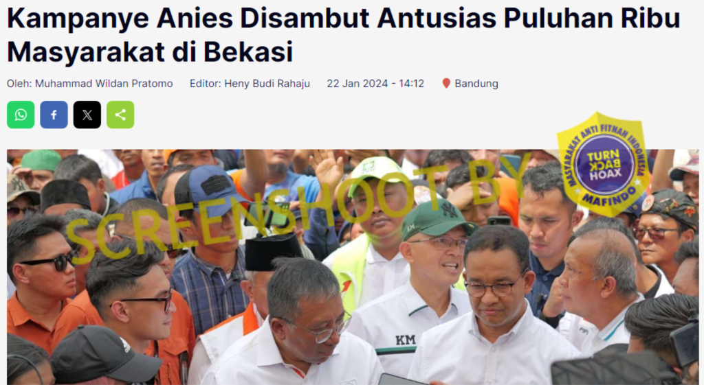 Namun setelah disimak isi video hanya berisi penjelasan dari narator yang membacakan ulang sebuah artikel dari RRI.co.id yang berjudul “Kampanye Anies Disambut Antusias Puluhan Ribu Masyarakat di Bekasi”.