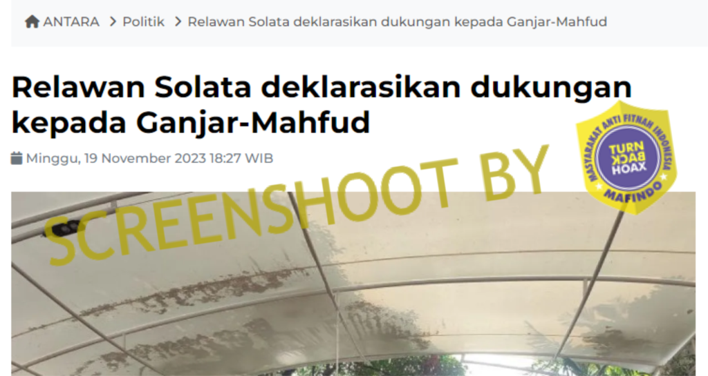 Dalam artikel tersebut hanya berisi pemberitaan mengenai Relawan Solata yang terdiri dari masyarakat etnis Toraja mendeklarasikan dukungan kepada capres/cawapres Ganjar-Mahfud dalam Pemilu 2024 (19/11/2023).
