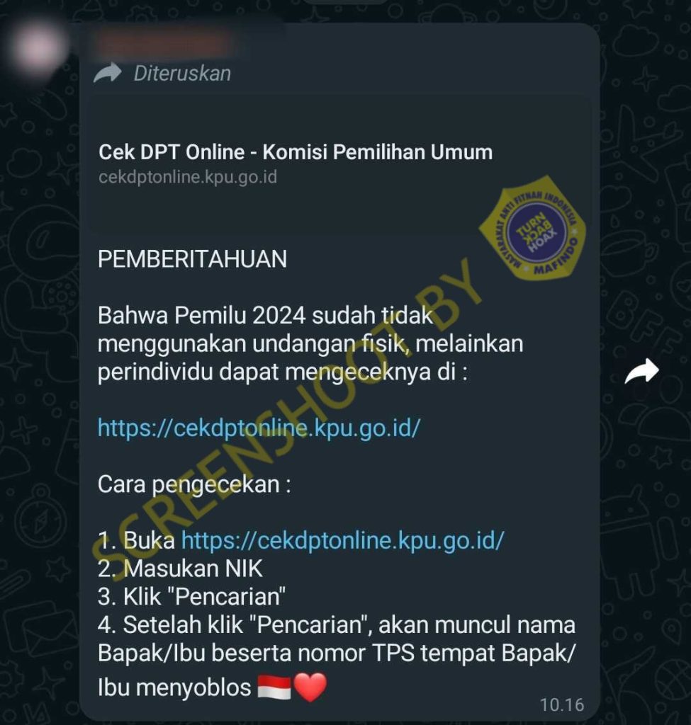 Beredar informasi di WhatsApp Grup yang menginformasikan jika Pemilu 2024 tidak lagi menggunakan undangan fisik. Pada pesan tersebut dijelaskan bahwa Komisi Pemilihan Umum Republik Indonesia (KPU RI) tidak membagikan undangan fisik lagi, namun diganti dengan mengecek secara mandiri di laman https://cekdptonline.kpu.go.id/.