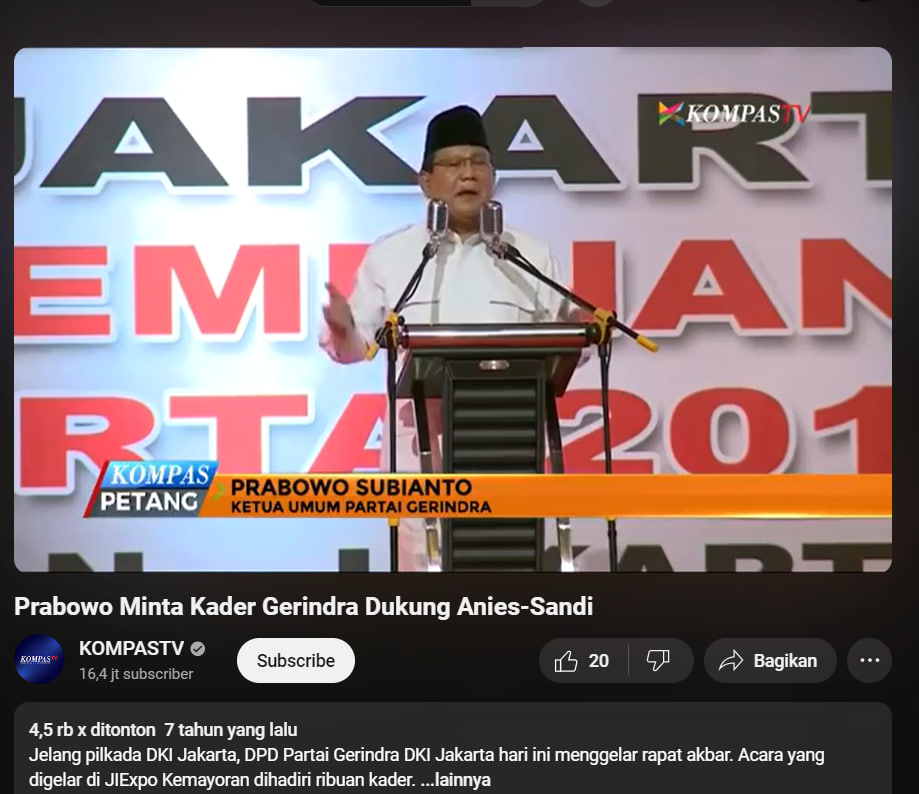 Setelah ditelusuri ditemukan video yang identik dengan postingan Tik Tok pada kanal Youtube KOMPAS TV “Prabowo Minta Kader Gerindra Dukung Anies-Sandi” yang diunggah pada 8 Januari 2017. Video pada Tik Tok sama dengan video di YouTube pada detik ke 31 pada video YouTube. Jika disimak dalam video tersebut Prabowo menyatakan dukungannya kepada Anies pada Pilkada DKI Jakarta bukan pada pilpres 2024. Video tersebut merupakan video saat rapat akbar yang digelar di JIExpo Kemayoran.