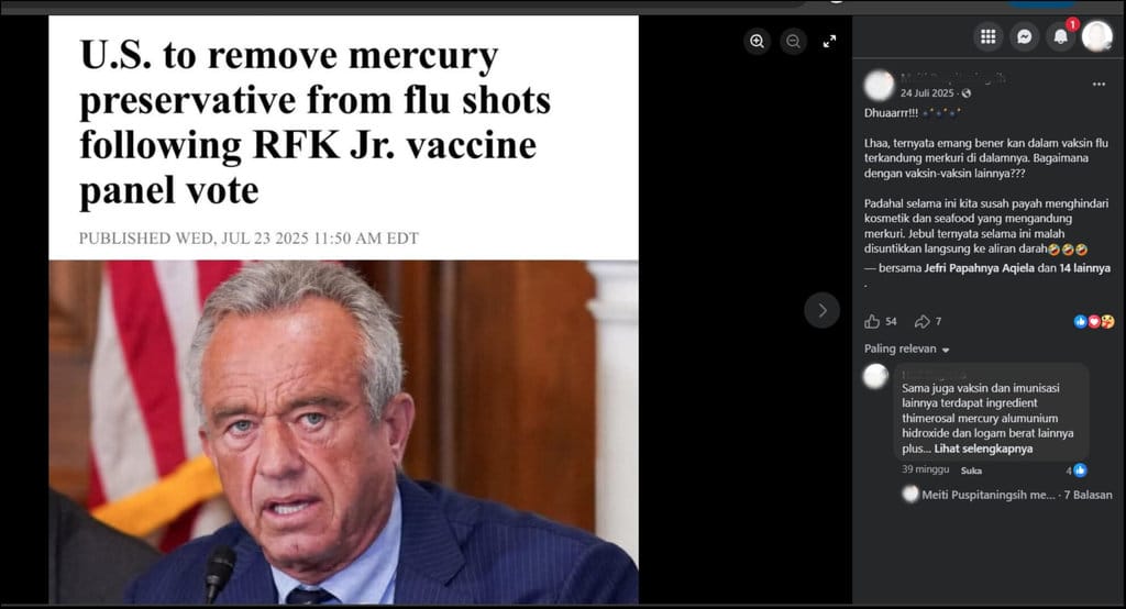 Di dalam unggahan, pengunggah menyertakan artikel berjudul “U.S. to remove mercury preservative from flu shots following RFK Jr. vaccine panel vote”.