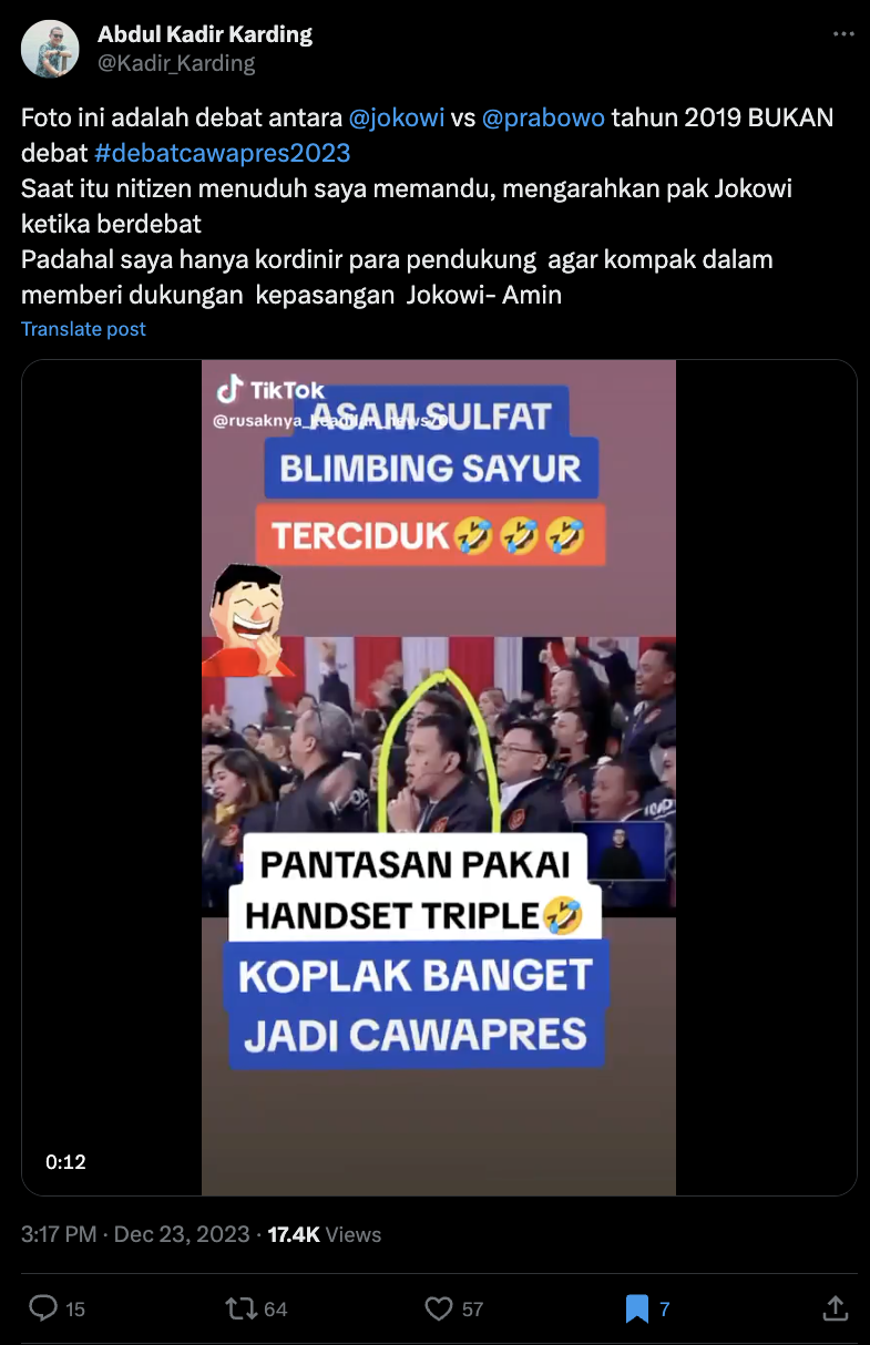 Setelah ditelusuri, sesorang dalam video tersebut adalah Abdul Kadir Karding, anggota Dewan Perwakilan Rakyat (DPR) Republik Indonesia. Mengetahui fotonya disalahgunakan, ia lantas memberikan klarifikasi langsung melalui akun Twitternya.