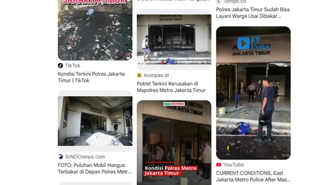 Penelusuran mengarah pada sejumlah situs di antaranya artikel foto berjudul "Puluhan Mobil Hangus Terbakar di Depan Polres Metro Jakarta Timur" yang dimuat situs photo.sindonews.com, pada 30 Agustus 2025.