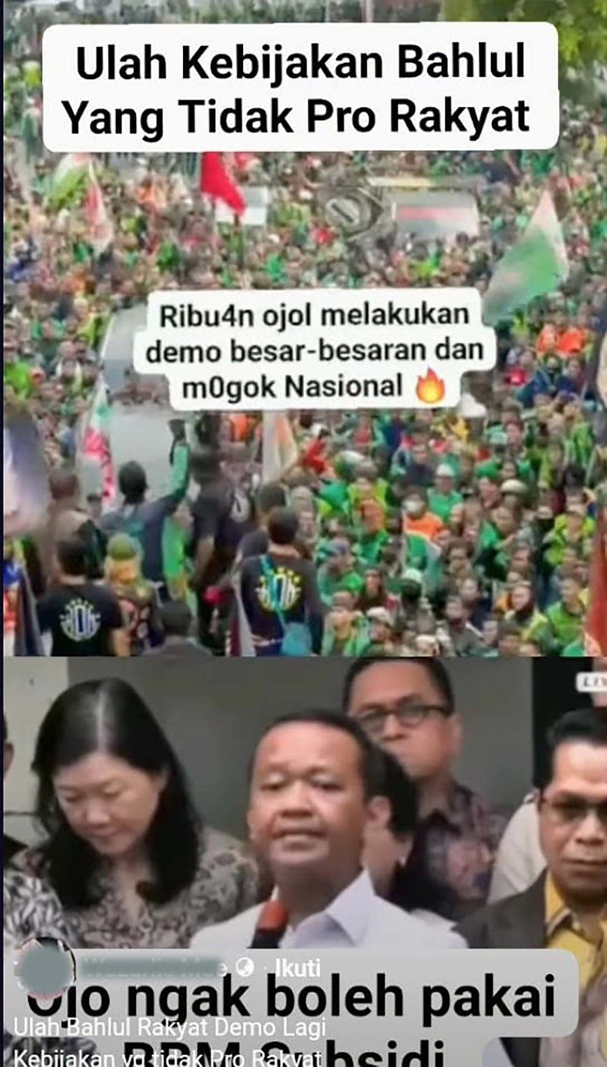 tirto.id - Beredar di media sosial, unggahan video yang menarasikan bahwa ribuan ojek online (ojol) demonstrasi besar-besaran ke jalan dan mogok massal karena diklaim tidak diperbolehkan menggunakan BBM subsidi. Dalam video tersebut, Menteri ESDM Bahlil Lahadalia dituding menjadi dalang dari kebijakan yang dinilai tidak pro-rakyat itu.