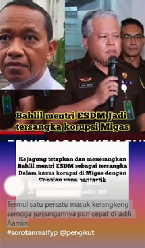 Narasi dalam unggahan itu menyebut bahwa dalam kesempatan tersebut, Menteri ESDM Bahlil Lahadalia telah ditetapkan sebagai tersangka dalam kasus korupsi tata kelola migas.
