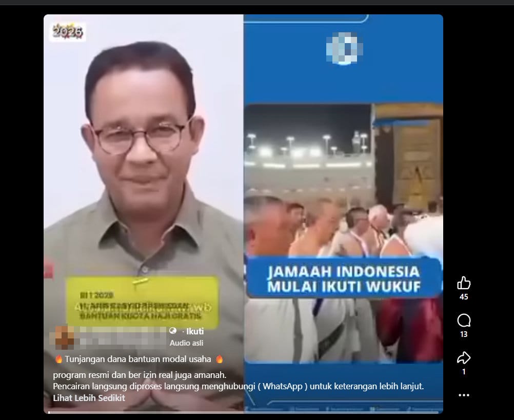 Namun, ditemukan keterangan tertulis dalam video dan caption yang ditulis pengunggah. Dalam gambar video dituliskan “RI 1 2029 H. Anies Rasyid Baswedan, bantuan kuota haji gratis.” Adapun yang tertulis dalam caption: “🔥Tunjangan dana bantuan modal usaha 🔥