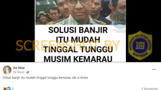 Akun Facebook An Nisa memposting sebuah gambar Anies disertai narasi “SOLUSI BANJIR ITU MUDAH TINGGAL TUNGGU MUSIM KEMARAU”. Postingan tersebut diunggah pada 26 Maret 2023.
