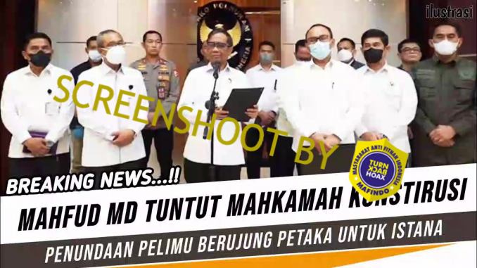 Sebuah akun Facebook dengan nama pengguna “Perspektif” mengunggah video dengan narasi bahwa Mahfud MD tuntut 5 miliar Mahkamah Konstitusi akibat penundaan pemilu.