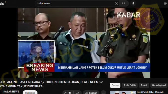 Channel YouTube Kabar News (https://www.youtube.com/@kabarnews672) pada 8 Juni 2023 mengunggah video dengan judul yang mengklaim bahwa Johnny G. Plate memohon untuk tidak dipenjara atas kasus korupsi dalam proyek penyediaan menara Base Transceiver Station (BTS) 4G Kementerian Komunikasi dan Informatika (Kominfo) yang menyeretnya. Selain itu, dituliskan pula bahwa aset negara sebesar 5,7 triliun juga telah dikembalikan.