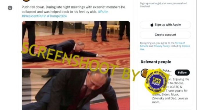 “Putin jatuh. Selama rapat larut malam dengan anggota mantan negara-negara bekas Uni Soviet, beliau pingsan dan dibantu berdiri kembali dengan menggunakan alat bantu. #Putin #PresidenPutin #Trump2024”.