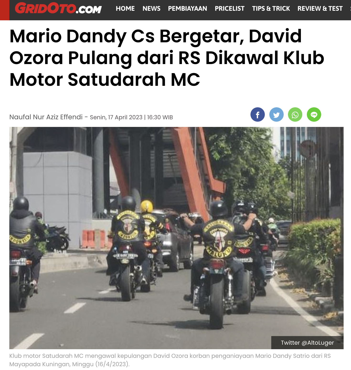 Dalam artikel yang diunggah pada 17 April 2023 tersebut, dijelaskan bahwa kepulangan David dari rumah sakit dikawal oleh klub motor Satudarah MC. Sebelumnya David dirawat di RS Mayapada selama 53 hari, usai menjadi korban penganiayaan Mario Dendy.