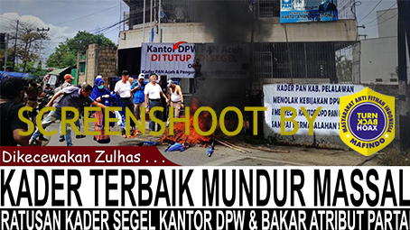 Kanal Youtube Teropong Istana mengunggah video dengan klaim kader Partai Amanat Nasional (PAN), melakukan aksi pembakaran dan penyegelan kantor Dewan Pimpinan Wilayah (DPW) karena dukungan partai terhadap Anies Baswedan. Video yang telah dilihat 4,5 ribu kali itu, menampilkan thumbnail suasana pembakaran atribut partai yang diklaim terjadi di depan kantor DPW PAN.