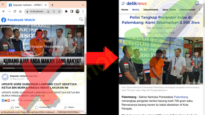 Salah satu sumber foto dengan konteks yang BENAR yang disunting dan digunakan untuk gambar pratinjau oleh SUMBER, detikNews pada 26 Feb 2020: “Palembang – Satres Narkoba Polrestabes Palembang menangkap pengedar berikut barang bukti 700 gram sabu. Rencananya barang haram itu bakal diedarkan di Kota Pempek