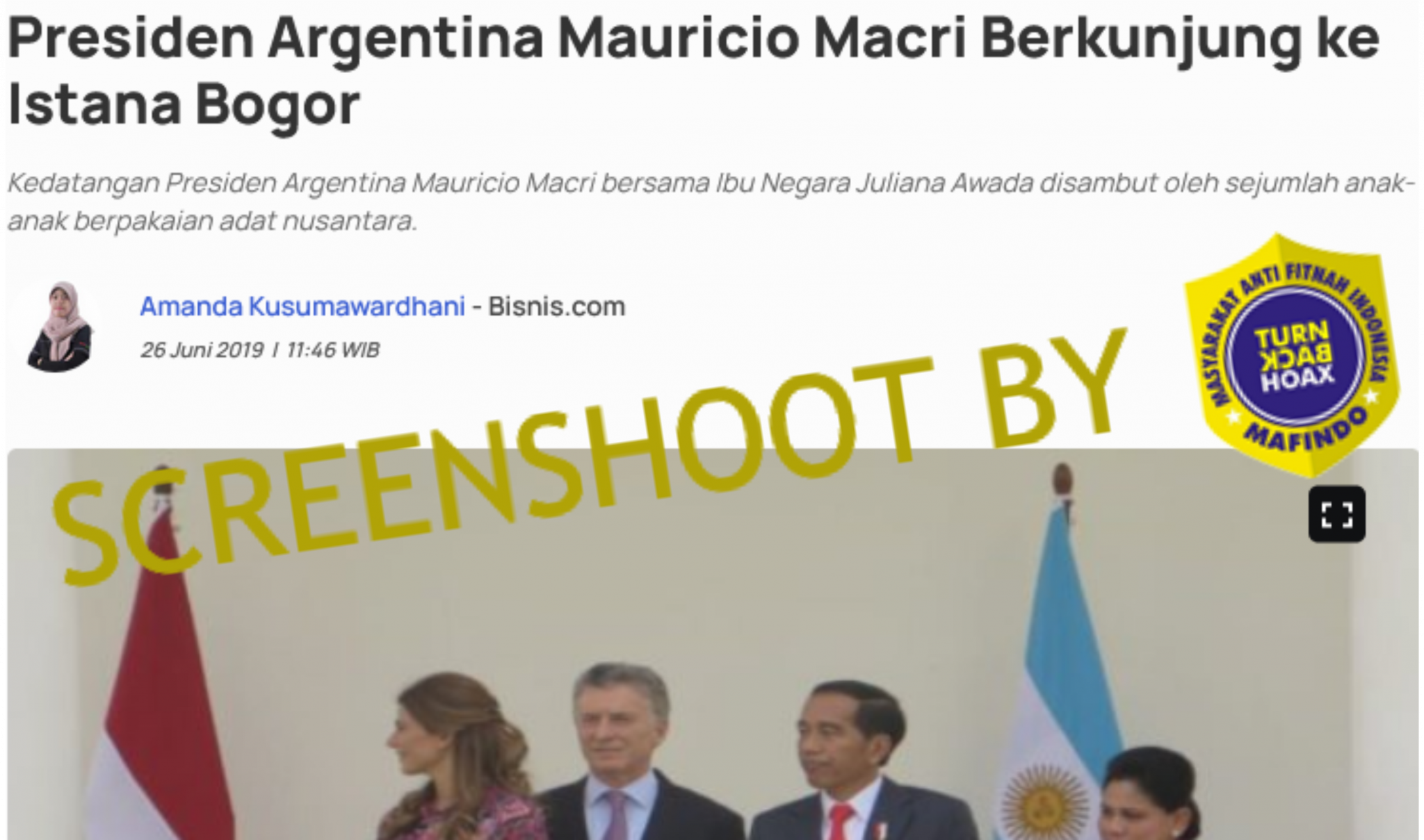 Dalam foto thumbnail tampak foto Presiden Argentina, Mauricio Macri yang menjabat pada tahun 2015-2019 itu sedang menyerahkan jersey timnas Argentina kepada Presiden Jokowi dan ditambah dengan kalimat pada gambar bahwa, “Presiden Argentina datang ke Indonesia demi loloskan Indonesia”, seolah kejadian tersebut masih ada hubungannya dengan perihal Piala Dunia U-20. Padahal foto tersebut diambil pada 2019 ketika Presiden Argentina tersebut berkunjung ke Indonesia.