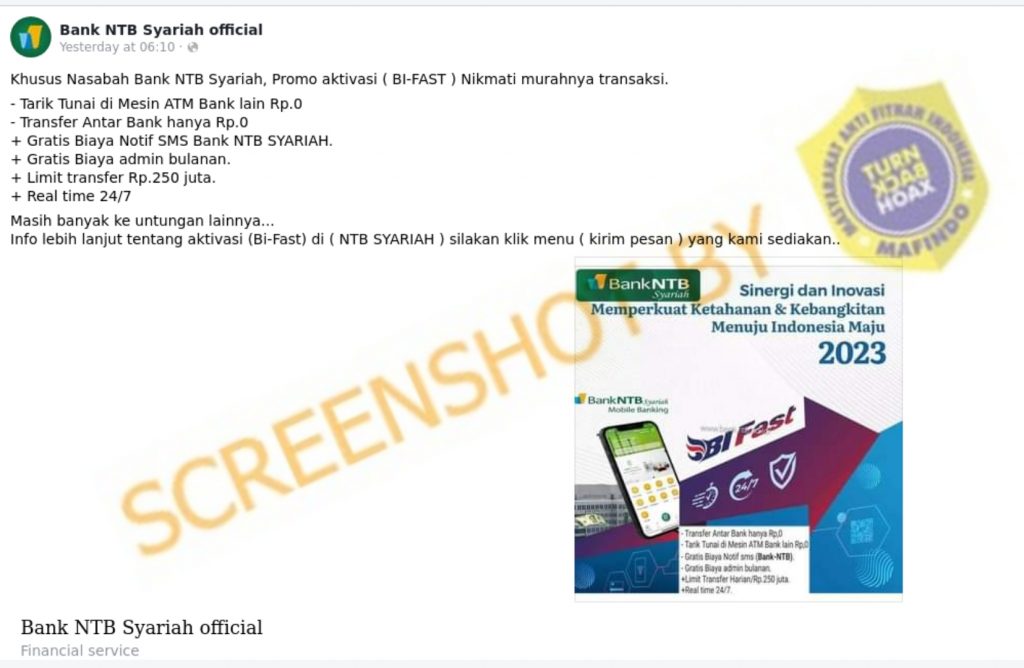Beredar akun Facebook mengatasnamakan Bank NTB Syariah Official yang menawarkan pengguna mobile banking Bank NTB Syariah untuk mendaftar BiFast dengan promo Rp0. Dalam postingan tersebut terhubung dengan nomor WhatsApp untuk mengaktivasi program BiFast.