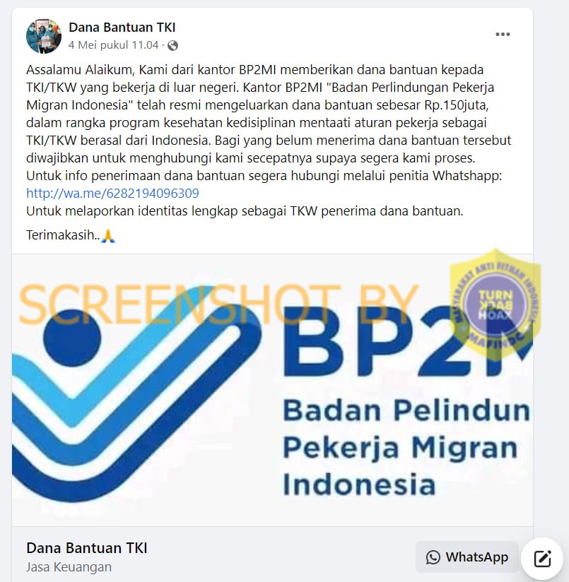 Akun Facebook Dana Bantuan TKI memposting sebuah informasi mengenai BP2MI memberikan dana bantuan kepada TKI/TKW sebesar RP 150 juta. Dalam postingan tersebut terdapat nomor Whatsaap untuk informasi penerimaan dana bantuan dan untuk melaporkan identitias lengkap sebagai TKW penerima dana bantuan. Postingan tersebut diunggah pada 4 MEi 2023 pukul 11.04.